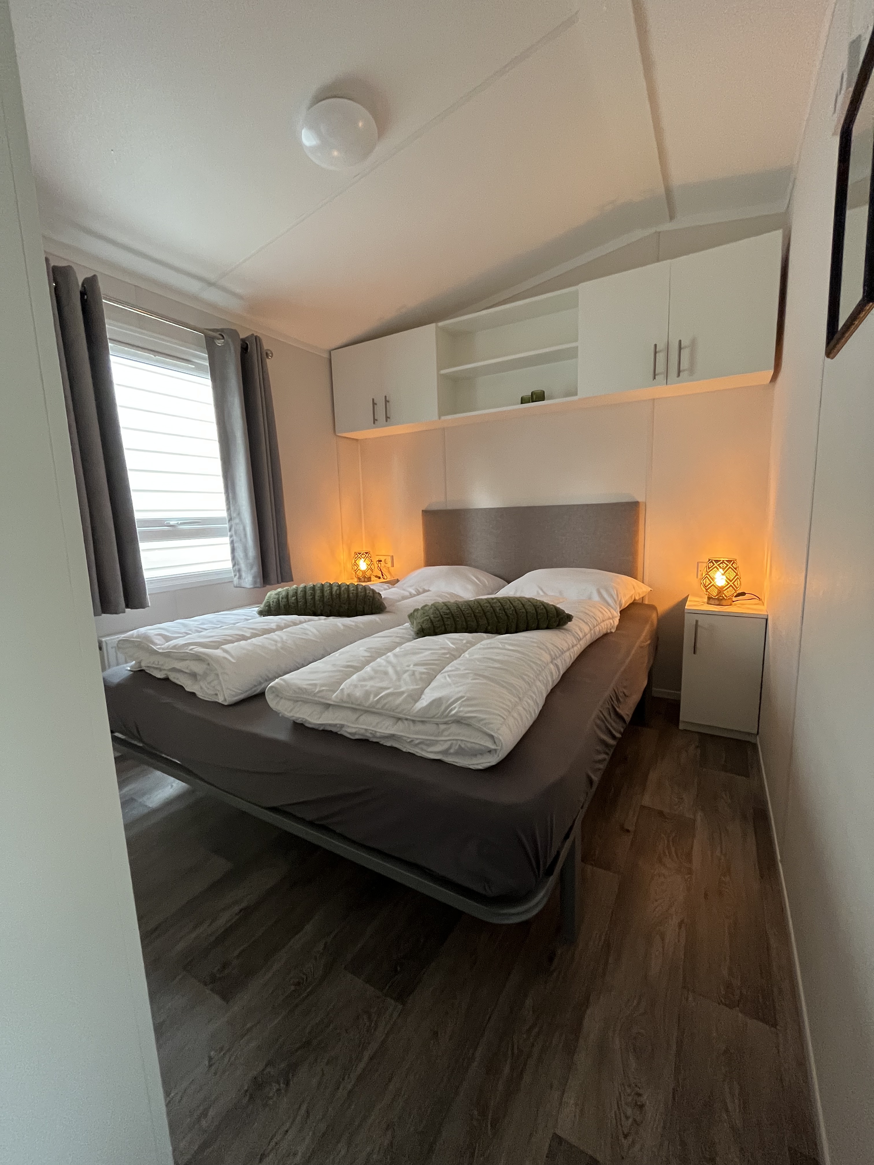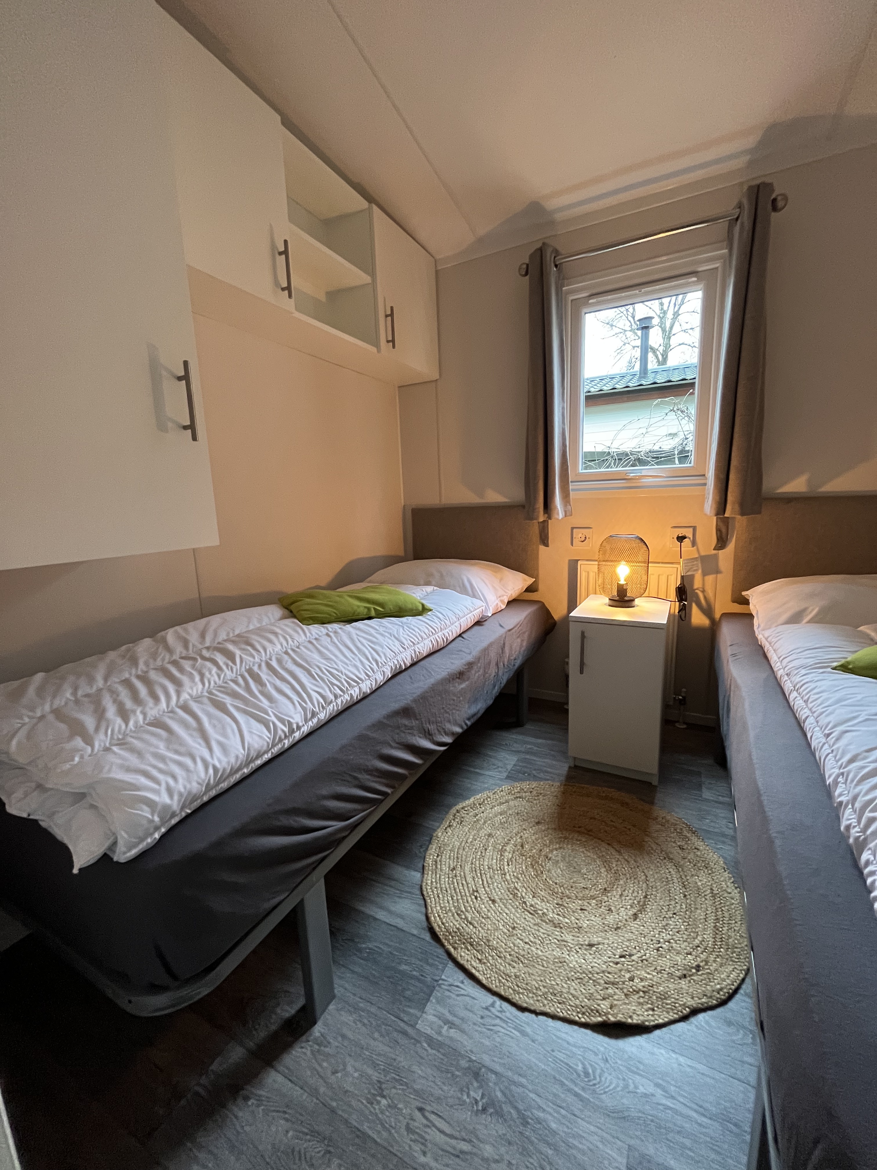 Er zijn twee slaapkamers in het chalet. De eerste slaapkamer is uitgevoerd met een tweepersoonsbed. De andere slaapkamer heeft twee éénpersoonsbedden. Er is één badkamer in het chalet.